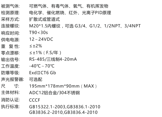 結(jié)構(gòu)模塊化、維護(hù)方便,接線安裝簡(jiǎn)單國(guó)瑞智能傳感器平臺(tái),可即插即用,無(wú)需現(xiàn)場(chǎng)標(biāo)定快速響應(yīng)、測(cè)量精度高,運(yùn)行穩(wěn)定的檢測(cè)儀器通過(guò)防爆認(rèn)證、防護(hù)等級(jí)IP65、防腐蝕性高、抗電磁干擾豐富的傳感器量程選擇,可以滿(mǎn)足客戶(hù)的要求智能傳感器平臺(tái),可即插即用,離線標(biāo)定LCD實(shí)時(shí)顯示氣體濃度,有儀器狀態(tài),故障和通訊異常提示功能可設(shè)置高低報(bào)警點(diǎn),兩級(jí)聲光報(bào)警兩路繼電器可以控制外圍設(shè)備(如風(fēng)機(jī)和聲光報(bào)警器)動(dòng)作產(chǎn)品選擇材質(zhì)優(yōu)秀,具有良好的密封性,防腐性,防爆和抗磁干擾強(qiáng)儀表具用4-20MA輸出與RS-485輸出可以與GRI-8000系列和GRI-9800系列報(bào)警主機(jī)組網(wǎng)使用可以與GRI-9802單點(diǎn)報(bào)警主機(jī)組網(wǎng),每點(diǎn)匹配,點(diǎn)點(diǎn)組合。